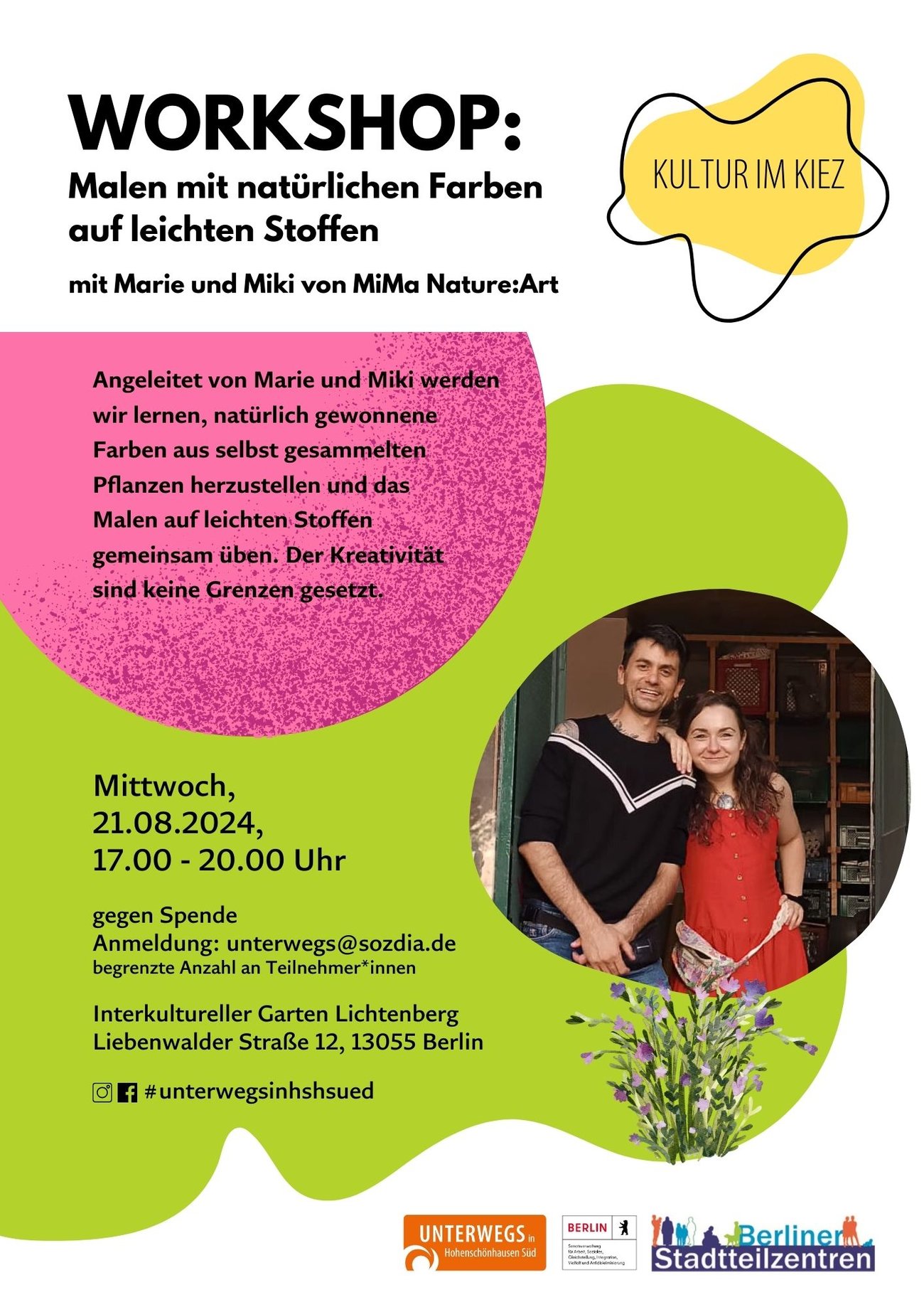 Marie und Mika von MiMa Nature:Art laden zum Kreativsein ein. In ihrem Workshop führen sie in die Herstellung von Farben aus selbst gesammelten Pflanzen ein und dem Malen mit diesen Farben auf leichten Stoffen.