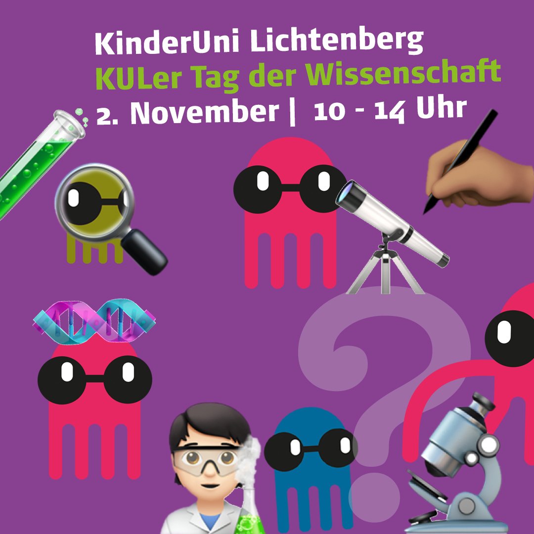 Zum Auftakt der KinderUni Lichtenberg am 2. November 2024 ist die ganze Familie zum KULen Tag der Wissenschaft in die Anna-Seghers-Bibliothek eingeladen. Von Theater-Vorlesung über Workshop bis zu Experimenten erwartet euch ein spannendes Programm. |