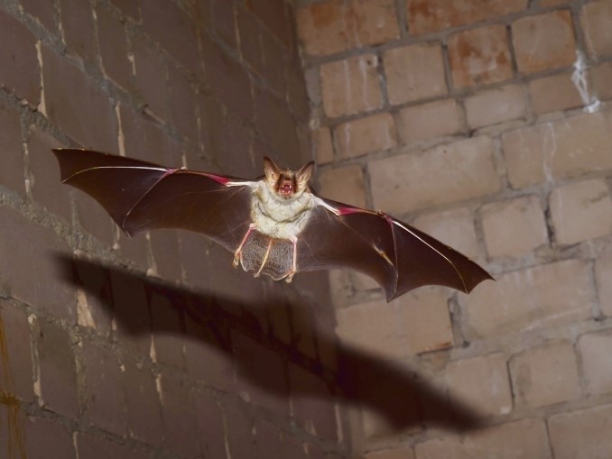 Großes Mausohr im Flug in einem Keller (© Florian Gloza-Rausch)