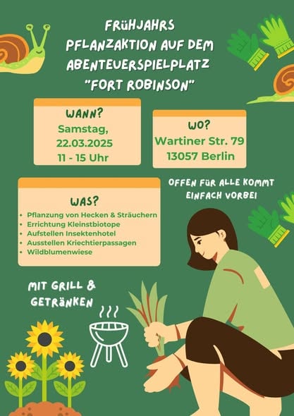 Der Arbeitskreis Umwelt und Bildung Lichtenberg (AUB) lädt gemeinsam mit dem Abenteuerspielplatz Fort Robinson zu einer Pflanzaktion für Klein und Groß auf dem Gelände des ASP ein. Neben der Pflanzung von Hecken und Sträuchern, wird es auch um die Schaffung von Lebensräumen gehen. Die Aktion ist für alle offen, kommt gerne vorbei. Es gibt auch die Möglichkeit Grillgut und Getränke zu erwerben.