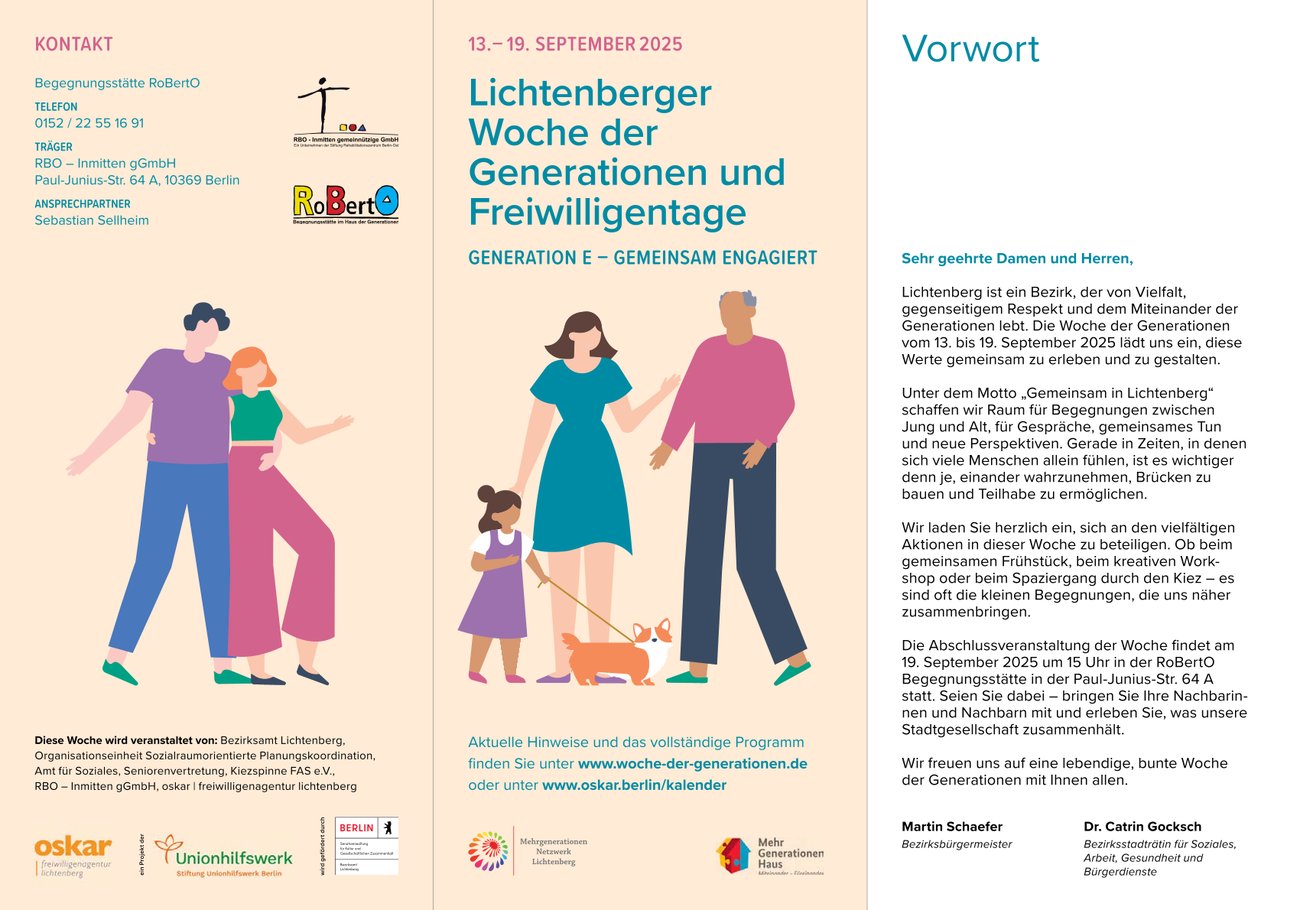 Die oskar | freiwilligenagentur unterstützt und fördert seit 2026 das bürgerschaftliche Engagement in Lichtenberg. Es ist ein Bezirk, der von Vielfalt, gegenseitigem Respekt und dem Miteinander der Generationen lebt. Die Woche der Generationen vom 13. bis 19. September 2025 lädt ein, diese Werte gemeinsam zu erleben und zu gestalten. Unter dem Motto „Gemeinsam in Lichtenberg“ wird Raum geschaffen für Begegnungen zwischen Jung und Alt, für Gespräche, gemeinsame Aktionen und neue Perspektiven. Gerade in Zeiten, in denen sich viele Menschen allein fühlen, ist es wichtiger denn je, einander wahrzunehmen, Brücken zu bauen und Teilhabe zu ermöglichen. Angeboten werden verschiede Mitmach-Aktionen wie: gemeinsames Gärtnern, interkulturelles Kochen, Basteln von Postkarten, gemeinsames Frühstück, kreative Workshops, Kiezspaziergänge und viele weitere. Die Abschlussveranstaltung der Woche findet am 19. September 2025 um 15:00 Uhr in der RoBertO Begegnungsstätte in der Paul-Junius-Str. 64 A statt.