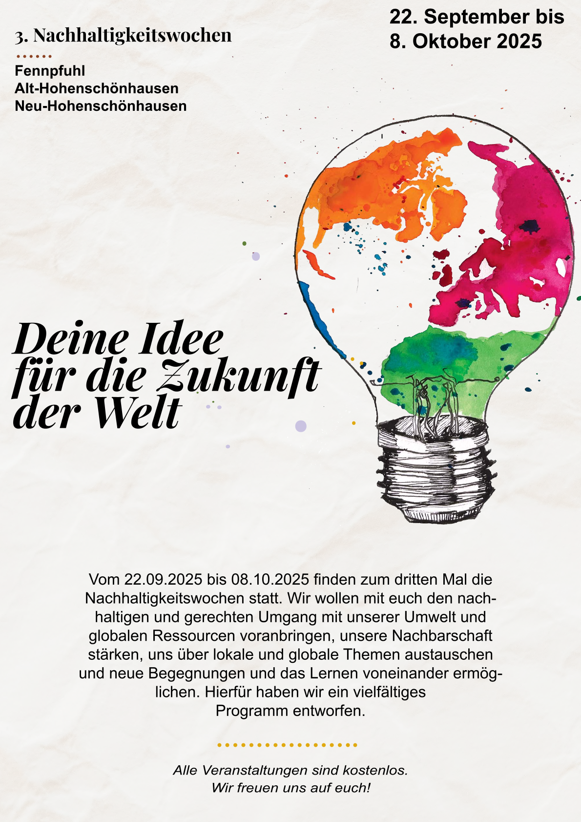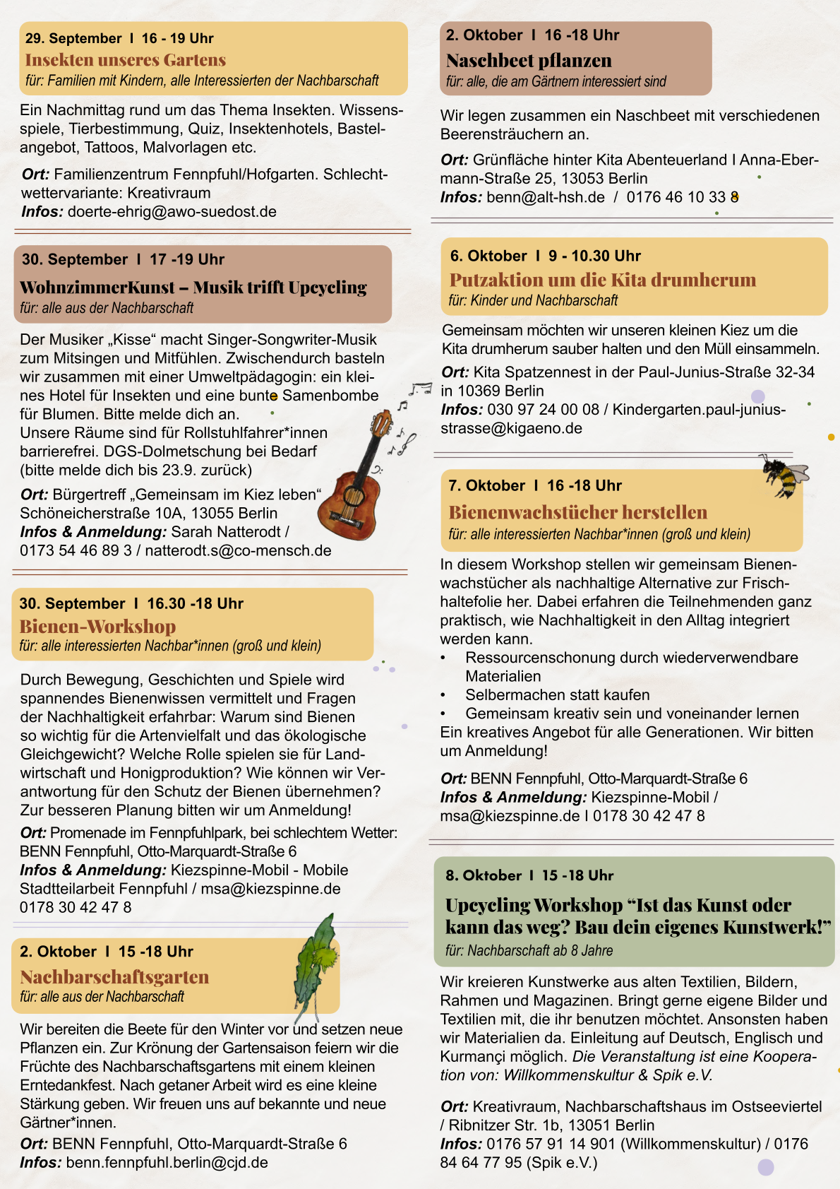 Initiativen, die sich für Nachhaltigkeit und Naturerleben engagieren. Eine ganze Woche voller Inspiration, Entdeckungen und Begegnungen – mitten in der Stadt! In über 50 unterschiedlichen Orten in Neukölln, mit mehr als 40 Initiativen. Mit mehr als 100 verschiedenen Veranstaltungen: Aktionen, Workshops, Ausstellungen, Führungen, Feste, Kiezspaziergänge und vieles Mehr.