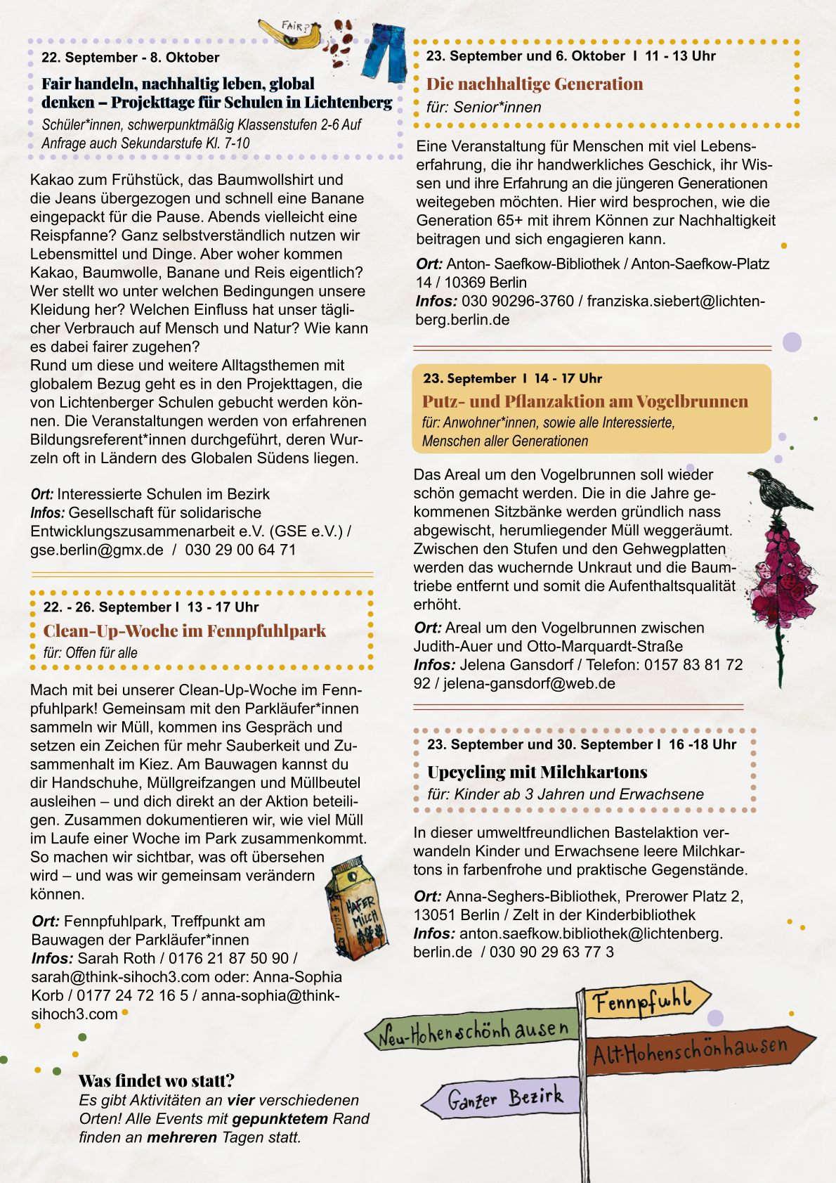 Zum dritten Mal veranstaltet BENN Fennpfuhl die Nachhaltigkeitswochen in Lichtenberg. Es wird ein Raum für Austausch zwischen der direkten Nachbarschaft geschaffen, um den nachhaltigen Umgang mit der Umwelt und den globalen Ressourcen zu stärken. Hierfür wurde ein vielfältiges Programm mit verschiedenen Akteur:innen entworfen. Das Programm befindet sich aktuell noch in der Planungsphase. Auf der Website von BENN Fennpfuhl können Sie demnächst mehr erfahren. Die Hauptaufgabe des BENN Programms ist die Förderung der Integration aller Menschen im Quartier. Gefördert wird die Aktion durch das BENN Programm (Berlin Entwickelt Neue Nachbarschaften) der Senatsverwaltung für Stadtentwicklung, Bauen und Wohnen.