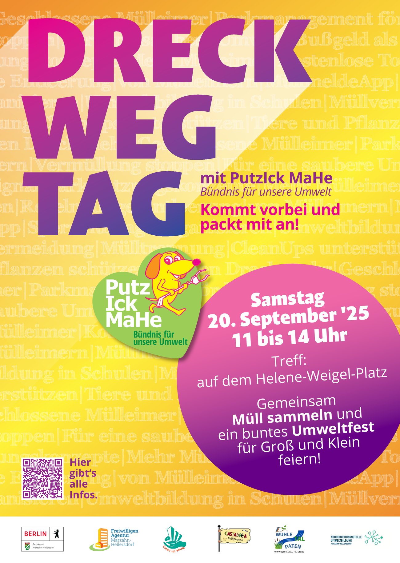 Die Aktion „Dreck-Weg“ wird vom Bündnis PutzIck MaHe veranstaltet und ruft dazu auf an diesem Tag mit anzupacken! Gemeinsam soll hierbei ein Zeichen für eine saubere und lebenswerte Stadt gesetzt werden! Die Aktion findet anlässlich des World Cleanup Day statt.