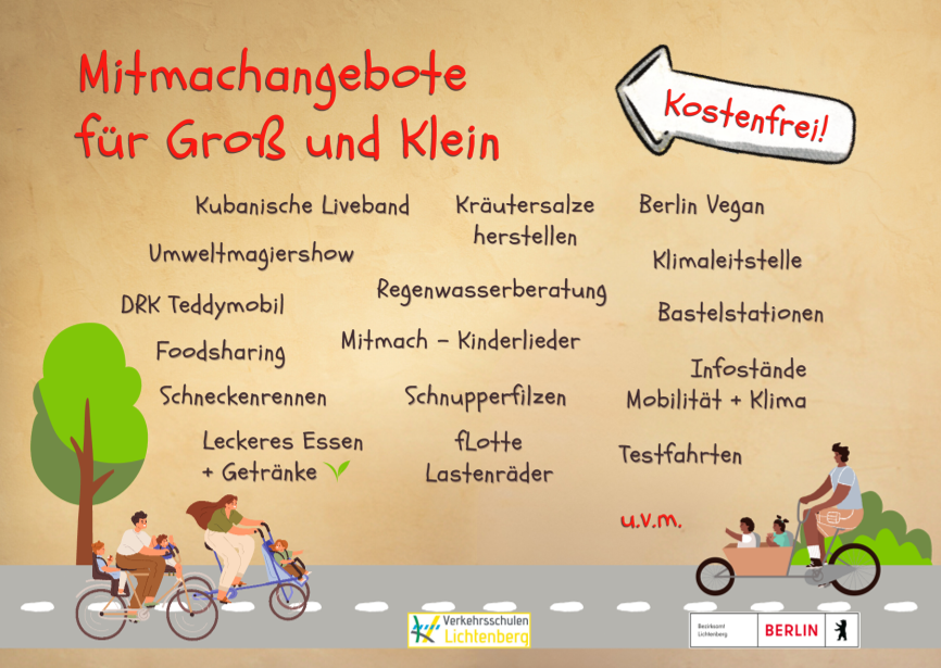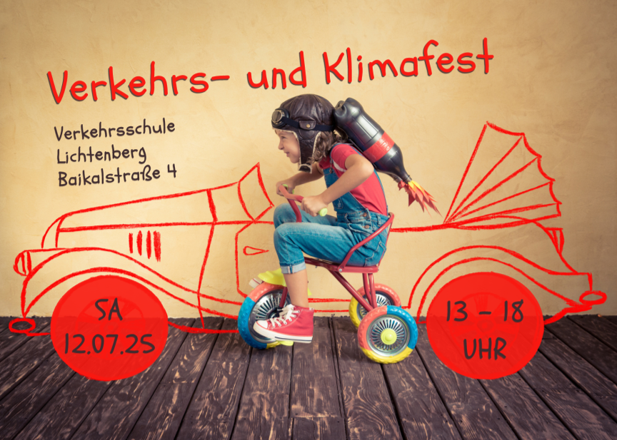 Am Samstag, den 12. Juli 2025, verwandelt sich die Verkehrsschule in der Baikalstraße von 13 bis 18 Uhr in einen bunten Ort für Klimaschutz, Kreativität und gemeinsames Lernen. Auch die Koordinierungsstelle Natur- und Umweltbildung Lichtenberg ist mit einem Stand dabei. Das Verkehrs- und Klimafest lädt Groß und Klein ein, aktiv zu werden, Neues zu entdecken und sich spielerisch mit den Themen Mobilität und Umwelt auseinanderzusetzen.