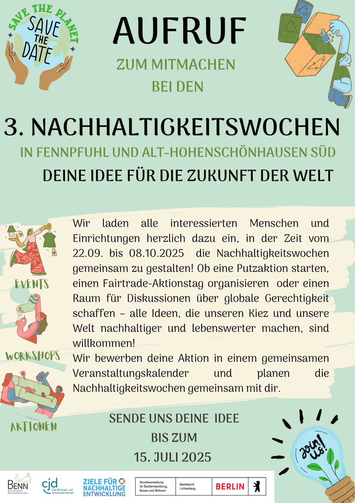 Zum dritten Mal finden dieses Jahr die Nachhaltigkeitswochen satt. Für ein vielfältiges und buntes Programm lädt BENN Fennpfuhl, als Organisator der Nachhaltigkeitswochen interessierte Menschen und Einrichtungen zur Teilnahme an der Gestaltung der Nachhaltigkeitswochen ein. Ideen zur Teilnahme können bis zum 15. Juli 2025 eingereicht werden.