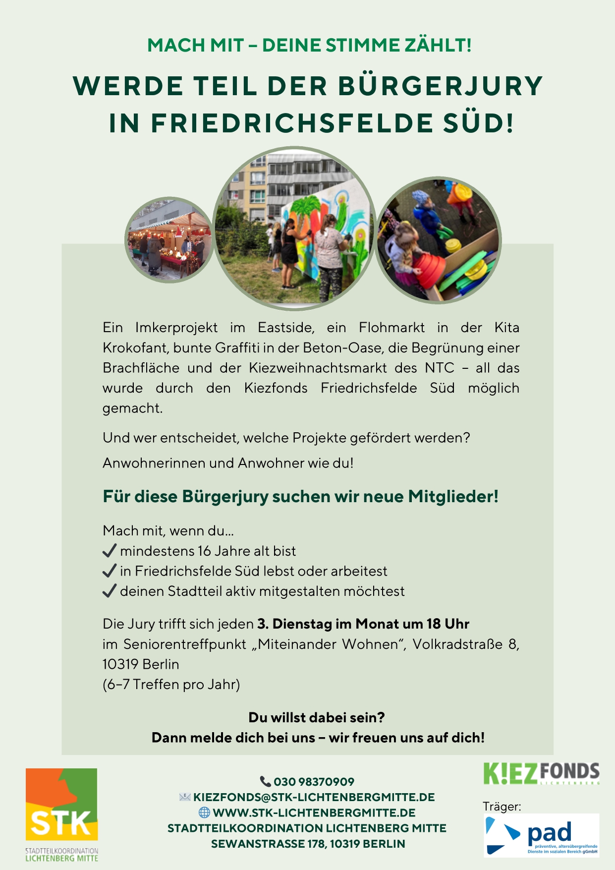 Die Stadtteilkoordination Lichtenberg Mitte sucht für 2026 noch Mitglieder für die Jury zur Vergabe der Kiezfond Fördermittel. Die Geschäftsstelle Kiezfonds für Friedrichsfelde Süd, begleitet und coacht die Kiezfonds-Antragstellung und unterstützt bei der Durchführung der jeweiligen Projekte. Die Stadtteilkoordination ist ein Projekt, das vom Bezirk Lichtenberg gefördert wird und entwickelt zusammen mit verschiedenen Ämtern der Bezirksverwaltung Handlungskonzepte und Formate für eine nachhaltige Vernetzung der Akteur:innen in Lichtenberg Mitte.