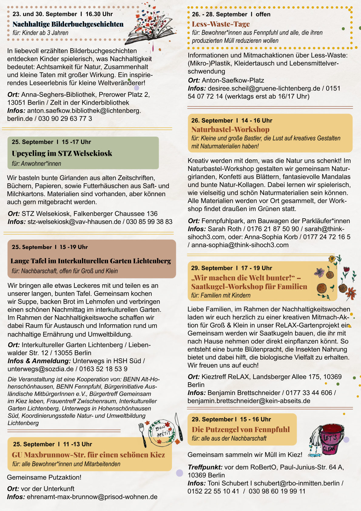 Alles rund ums Thema Einschulung wird am Aktionstag - Mein Kind kommt 2026 in die Schule - thematisiert. Im Seepark findet auch dieses Jahr wieder das Traberwegfest statt und Lichtenberg plant viele Aktionen im Rahmen der Nachhaltigkeitswochen. Auch die Anmeldung für den Tag der Umweltbildung an Lichtenberger Schulen ist noch möglich. Lassen Sie sich von den vielfältigen Angeboten inspirieren!